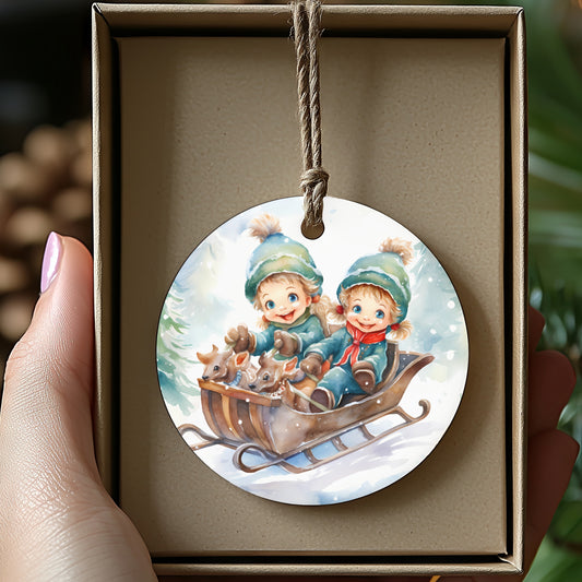 Two Girls on a Sleigh with Reindeer Christmas Ornament