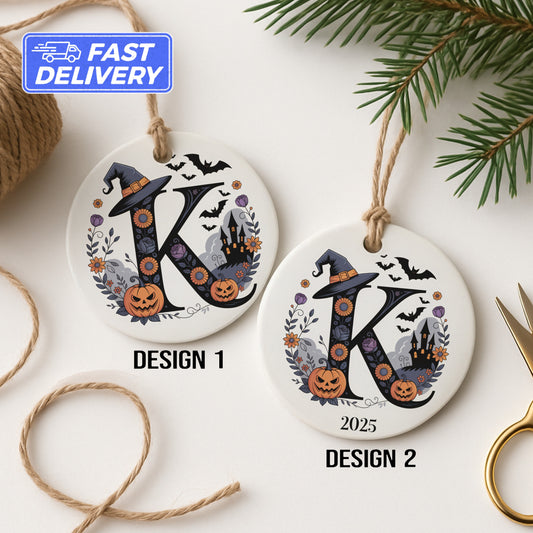 Custom Letter K Halloween Ornament, Spooky Initial Ornament, Personalized Name Ornament, Witch Hat, Bats, Pumpkin, Haunted House