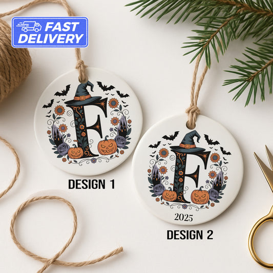 Custom Initial F Halloween Ornament, Monogram Witch Hat Decor, Personalized 2025 Ceramic Ornament, Spooky Floral Initial Gift Idea