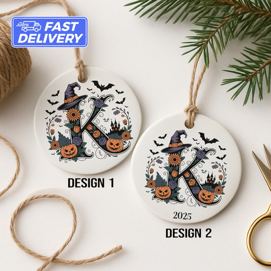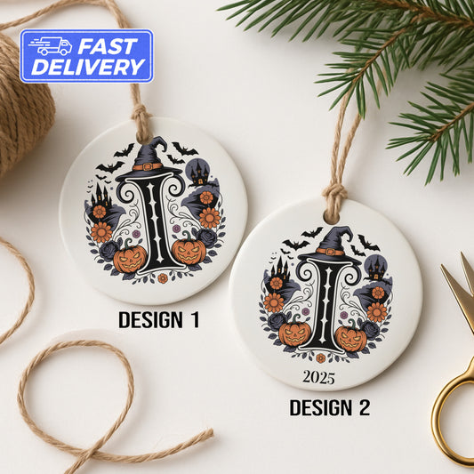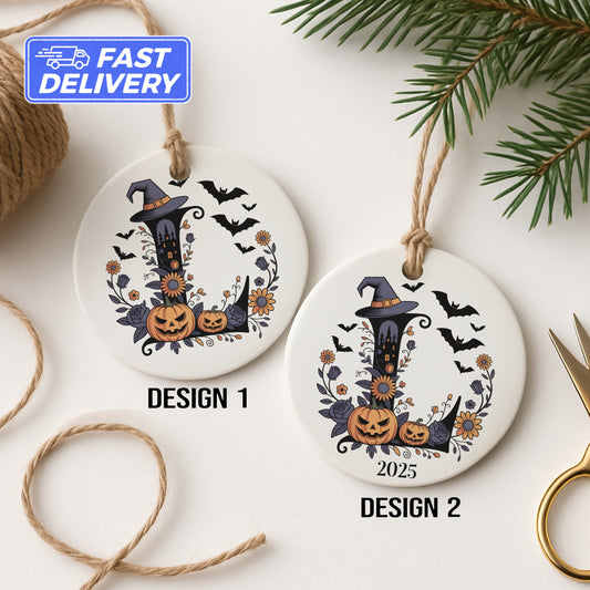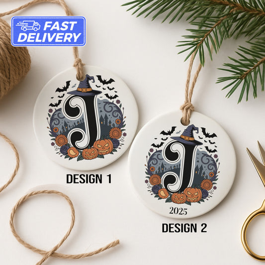 Custom Letter J Halloween Ornament, Witch Hat Pumpkins Bats, Personalized Initial Year Ceramic Ornament, Spooky Season Holiday Keepsake