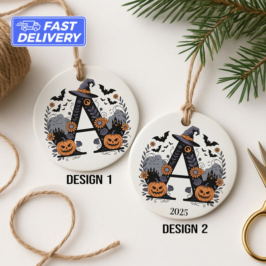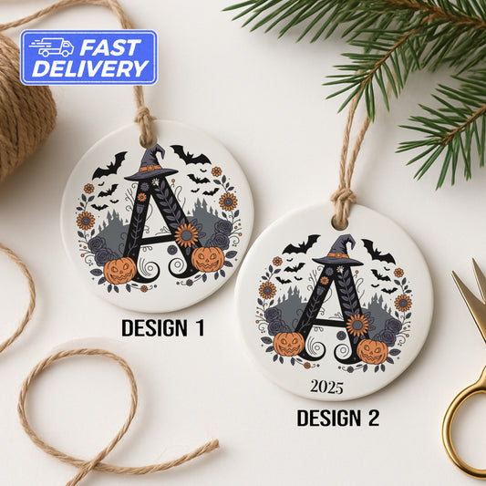 Custom Letter A Halloween Ornament, Witch Hat Bats, Spooky Pumpkin Floral Ornament, Personalized Ceramic Ornament, Halloween Decor