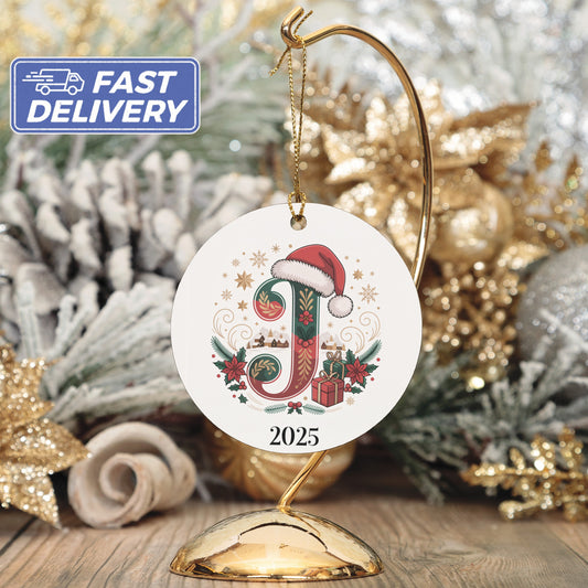 Custom Letter J Ornament 2025, Santa Hat Holiday Decor, Personalized Initial Ornament, Christmas Gift, Keepsake, Xmas Tree Ornament