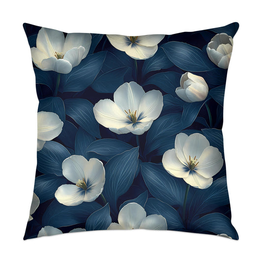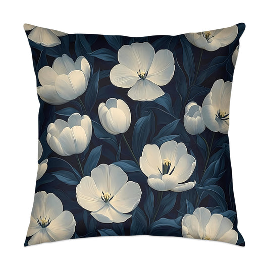Floral throw pillow, elegant white flowers design, navy blue leaves, decorative cushion for sofa, living room decor, gift idea
