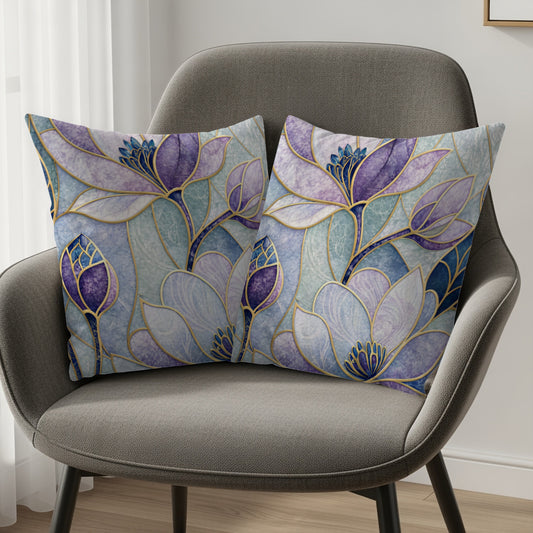 Blue Purple Floral Stained Glass Style Pattern Throw Pillows