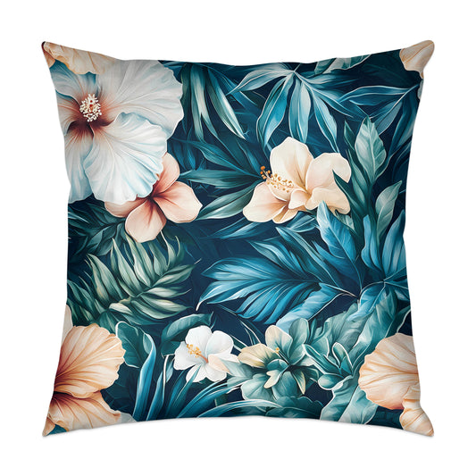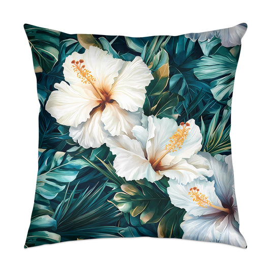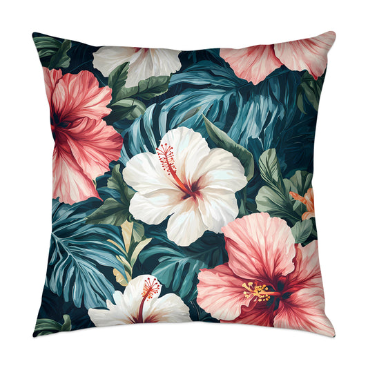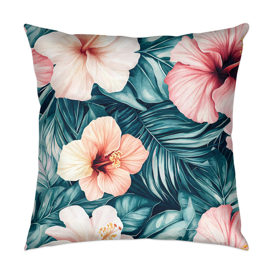 Tropical Floral Throw Pillow, Hibiscus Flower Pillow, Exotic Leaves Cushion, Beach House Decor, Summer Living Room Pillow
