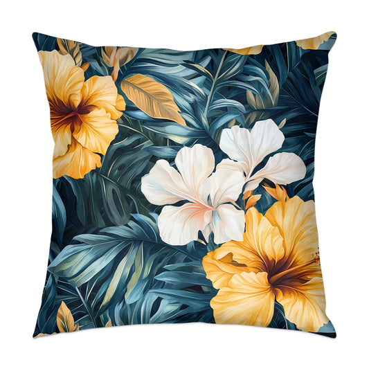 Tropical Floral Throw Pillow, Bold Yellow and White Flowers, Exotic Leaf Pattern, Decorative Cushion, Living Room Accent Pillow