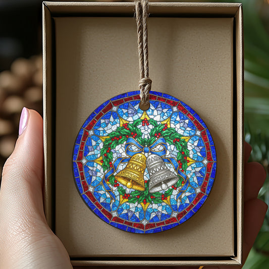 Stained Glass Christmas Bells Ornament, Holiday Wreath Ornament, Bells with Bow Gift, Unique Decoration, Festive Keepsake Gift