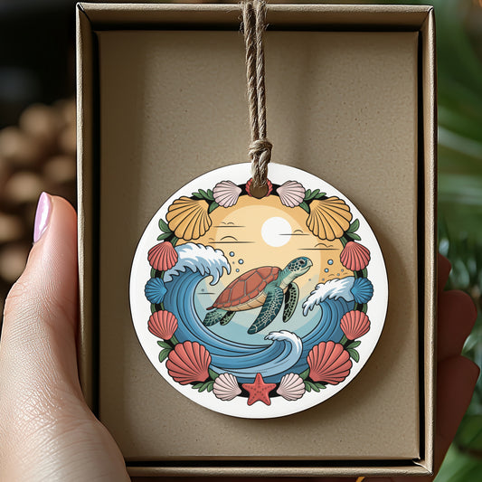 Sea Turtle Ornament, Ocean Wave Shells, Beach House Decor, Coastal Gift, Marine Life Art, Sea Turtle Lover Gift, Ornament