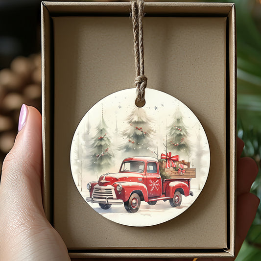 Red Truck With Gifts in Winter Wonderland Scene Ornament
