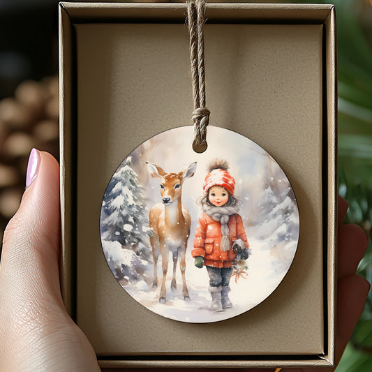 Deer and Little Girl Winter Wonderland Scene Home Ornament