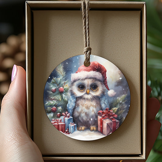 Festive Owl in Santa Hat with Gifts Holiday Round Ornament