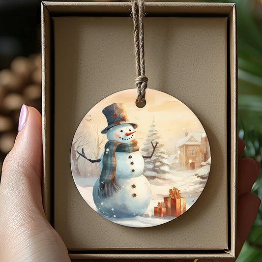 Snowman In Winter Scene With Gifts Holiday Snow Ornament